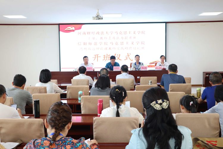 729-84日,河南財經(jīng)政法大學(xué)馬克思主義學(xué)院干部、教師素質(zhì)能力提升班與信陽師范學(xué)院馬克思主義學(xué)院思想政治理論課教師實(shí)踐研修班在我院隆重舉辦。30日上午,舉行了開班儀式。開班儀式由班主任劉進(jìn)主持,太行山干部學(xué)院負(fù)責(zé)人呂偉軍同志作開班致辭,河南財經(jīng)政法大學(xué)馬克思主義學(xué)院院長趙增彥同志作開班動員,信陽師范學(xué)院馬克思主義學(xué)院院長楊云善同志為培訓(xùn)班授旗。